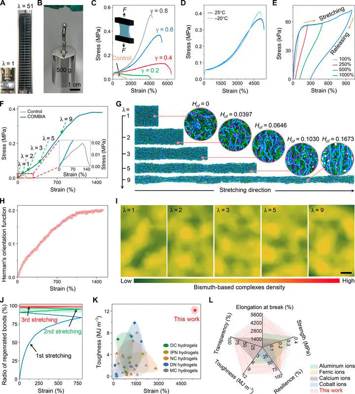 Artificial skin is essential for bionic robotics, facilitating human skin–like functions such as sensation, communication, and protection. However, replicating a skin-matched all-in-one material with excellent mechanical properties, self-healing, adhesion, and multimodal sensing remains a challenge. Herein, we developed a multifunctional hydrogel by establishing a consolidated organic/metal bismuth ion architecture (COMBIA). Benefiting from hierarchical reversible noncovalent interactions, the COMBIA hydrogel exhibits an optimal combination of mechanical and functional properties, particularly its integrated mechanical properties, including unprecedented stretchability, fracture toughness, and resilience. Furthermore, these hydrogels demonstrate superior conductivity, optical transparency, freezing tolerance, adhesion capability, and spontaneous mechanical and electrical self-healing. These unified functions render our hydrogel exceptional properties such as shape adaptability, skin-like perception, and energy harvesting capabilities. To demonstrate its potential applications, an artificial skin using our COMBIA hydrogel was configured for stimulus signal recording, which, as a promising soft electronics platform, could be used for next-generation human-machine interfaces.