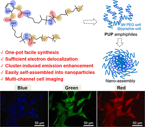 The development of single-component materials with low cytotoxicity and multichannel fluorescence imaging capability is a research hotspot. In the present work, highly electron-deficient pyrazine monomers were covalently connected into a polyurethane backbone using addition polymerization with terminal poly(ethylene glycol) monomethyl ether units containing a high density of electron pairs. Thereby, an amphiphilic polyurethane-pyrazine (PUP) derivative has been synthesized. The polymer displays cluster-induced emission through compact inter- and/or intramolecular noncovalent interactions and extensive through-space electron coupling and delocalization. Molecular rigidity facilitates red-shifted emission. Based on hydrophilic/hydrophobic interactions and excitation dependence emission at low concentrations, PUP has been self-assembled into fluorescent nanoparticles (PUP NPs) without additional surfactant. PUP NPs have been used for cellular multicolor imaging to provide a variety of switchable colors on demand. This work provides a simple molecular design for environmentally sustainable, luminescent materials with excellent photophysical properties, biocompatibility, low cytotoxicity, and color modulation.