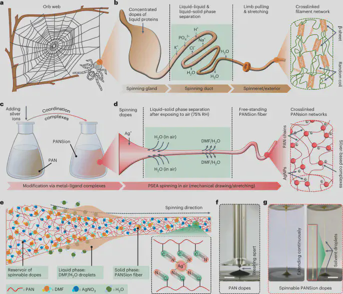 Soft fibres can be used to make smart textiles for use in energy, sensing and therapeutic applications. However, the fabrication of functional fibres is difficult compared with the fabrication of two-dimensional films and three-dimensional monoliths, and current methods typically require high temperatures, high volumes of solvents or complex systems. Here we report a spinning approach to fabricate functional fibres, which is based on spontaneous phase separation and is inspired by the silk-spinning processes of spiders. The silk-spinning process is mimicked by creating a spinning solution of polyacrylonitrile and silver ions, which forms an elastic supramolecular network with silver coordination complexes and in situ reduced silver nanoparticles. This approach, which operates at ambient pressure and temperature, can be used to make soft functional fibres that are mechanically stretchable (more than 500% strain), strong (more than 6 MPa) and electrically conductive (around 1.82 S m−1). To illustrate the capabilities of the technique, we use the fibres to create a sensing glove and a smart face mask.
