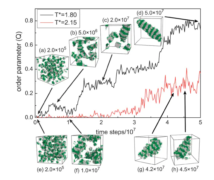 We study the self-assembly of symmetric star-like block copolymers (Ax)y(Bx)yC in dilute solution by using Brownian dynamics simulations. In the star-like block copolymer, incompatible A and B components are both solvophobic, and connected to the center bead C of the polymer. Therefore, this star-like block copolymer can be taken as a representative of soft and deformable Janus particles. In our Brownian dynamics simulations, these “soft Janus particles” are found to self-assemble into worm-like lamellar structures, loose aggregates and so on. By systematically varying solvent conditions and temperature, we build up the phase diagram to illustrate the effects of polymer structure and temperature on the aggregate structures. At lower temperatures, we can observe large worm-like lamellar aggregates. Upon increasing the temperature, some block copolymers detach from the aggregate; this phenomenon is especially sensitive for the polymers with less arms. The aggregate structure will be quite disordered when the temperature is high. The incompatibility between the two parts in the star-like block copolymer also affects the self-assembled structures. We find that the worm-like structure is longer and narrower as the incompatibility between the two parts is stronger.