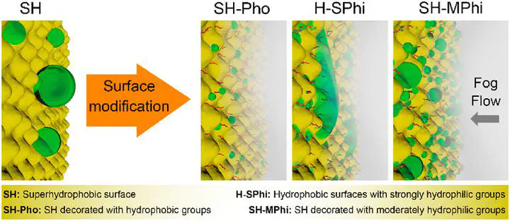 Inspired by the distinct functions of desert beetles with efficient droplet nucleation and lotus leaves with excellent droplet removal, an integrated method is presented for the design of a superhydrophobic surface decorated with hydrophilic groups that can efficiently nucleate and remove water droplets. We constructed a cellulose-based superhydrophobic surface containing numerous olefin terminal groups by solvent exchange and spray coating. This surface is different from most of the reported biomimicking water harvesting surfaces that rely on complicated lithography and micropatterning techniques requiring special instruments. The obtained superhydrophobic surface was further modified using various thiol compounds via a thiol–ene reaction to manipulate the water harvesting property. The modified surfaces containing hydrophobic groups (e.g., 1-octadecanethiol and 1H,1H,2H,2H-perfluorodecanethiol) or a strong hydrophilic group (e.g., 3-mercaptopropionic acid and 6-mercapto-1-hexanol) exhibited insufficient fog collecting abilities due to poor water droplet nucleation or strong water adhesion. By contrast, the modified surface decorated with moderately hydrophilic amino groups combines the advantages of biological surfaces with distinct wetting features (such as fog-harvesting beetles and water-repellent lotus leaves), resulting in accelerated water nucleation and less compromise of the water removal efficiency. Molecular dynamic simulations revealed that the efficient droplet nucleation is attributed to the hydrophilic amino groups whereas the rapid droplet removal is due to the maintained superhydrophobicity of the amino group-modified surface. This strategy of decorating a superhydrophobic surface with moderately hydrophilic functional groups provides insight into the manipulation of droplet nucleation and removal for water collection efficiency.