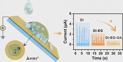 Charge-transfer mechanisms in adaptive multicomponent solutions at liquid–solid interfaces with triboelectric probes are crucial for understanding chemistry dynamics. However, liquid–solid charge transfer becomes unpredictable, due to the components or interactions in solutions, restricting its potential application for precise monitoring of liquid environments. This study utilizes triboelectric probes to investigate the charge transfer of chemicals, applying this approach to real-time coolant state monitoring. Analysis of electrical signal dynamics induced by ethylene glycol and its oxidation byproduct, oxalic acid, in ethylene glycol solutions reveals that hydrogen bond and ion adsorption diminishes the efficiency of electron transfer at the liquid–solid interface. These findings promote the engineering of the triboelectric probe that enhances coolant quality with remarkable sensitivity (detection limit:0.0001%) and a broad freezing point operational range (0 to −49 °C). This work advances the precise control of the charge dynamics and demonstrates the potential of triboelectric probes for interdisciplinary applications.