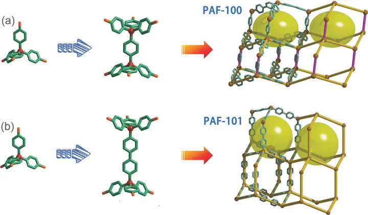 The construction of excellent porous organic frameworks (POFs) with high surface areas and stability is always a tremendous challenge in synthetic chemistry. The geometric configuration and reactive group of building unit are crucial factors to influence the structure and porosity of the resulting product. Herein, the design, synthesis, and characterization of two porous aromatic framework (PAF) materials, named PAF-100 and PAF-101, are reported via a strategy of building unit engineering. PAF-100 and PAF-101 present high Brunauer–Emmett–Teller surface areas exceeding 5000 m2 g−1 and uniform pore size distributions. Furthermore, PAF-100 and PAF-101 show high methane uptake with value of 742 and 622 cm3 g−1, respectively, at 298 K and 70 bar. The successful synthesis of PAFs with exceptional porosity from engineered building unit is powerful for constructing highly porous POFs.