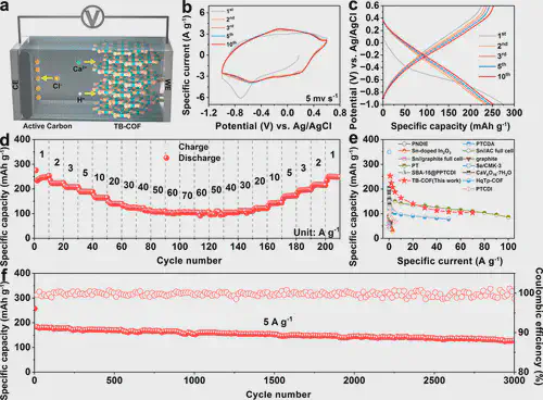 Organic materials are promising for cation storage in calcium ion batteries (CIBs). However, the high solubility of organic materials in an electrolyte and low electronic conductivity remain the key challenges for high-performance CIBs. Herein, a nitrogen-rich covalent organic framework with multiple carbonyls (TB-COF) is designed as an aqueous anode to address those obstacles. TB-COF demonstrates a high reversible capacity of 253 mAh g–1 at 1.0 A g–1 and long cycle life (0.01% capacity decay per cycle at 5 A g–1 after 3000 cycles). The redox mechanism of Ca2+/H+ co-intercalated in COF and chelating with C═O and C═N active sites is validated. In addition, a novel C═C active site was identified for Ca2+ ion storage. Both computational and empirical results reveal that per TB-COF repetitive unit, up to nine Ca2+ ions are stored after three staggered intercalation steps, involving three distinct Ca2+ ion storage sites. Finally, the evolution process of radical intermediates further elucidates the C═C reaction mechanism.