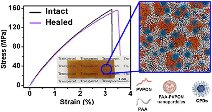 Noncovalently cross-linked polymer materials through healing, recycling, and reprocessing can reduce materials consumption and alleviate environmental pollution. However, it remains a huge challenge to fabricate super-strong noncovalently cross-linked polymer materials with mechanical strength comparable to high-performance engineering polymers. Herein, healable and reprocessable noncovalently cross-linked polymer composites with an unprecedented mechanical strength are fabricated by complexation of polyacrylic acid (PAA), polyvinylpyrrolidone (PVPON), and carbonized polymer dots (CPDs) (denoted as PAA-PVPON-CPDs). The incorporation of 15 wt % CPDs generates PAA-PVPON-CPDs composites with a tensile strength of ∼158 MPa and Young’s modulus of ∼8.2 GPa. Serving as nanofillers, the CPDs can establish strong interactions with polymers in PAA-PVPON composites. The CPDs and the in situ-formed PAAPVPON nanoparticles work in concert to significantly strengthen the PAA-PVPON-CPDs composites to an unprecedented strength. The PAA-PVPON-CPDs composites exhibit excellent impact resistance and damage tolerance because of the high mechanical strength of the composites and the energy dissipation mechanism of the CPDs and PAA-PVPON nanoparticles. Moreover, the fractured PAA-PVPON-CPDs composites can be healed to restore their original mechanical strength.