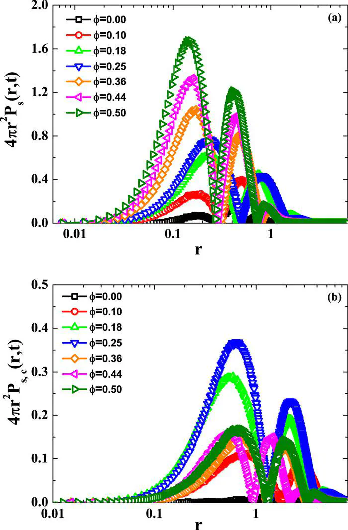 We present a systematic investigation on the effect of adding nanoparticles on the dynamics of polymer chains by using coarse-grained molecular dynamics simulation. The dynamics is characterized by three aspects:molecular motion, relaxation at different length scales, and dynamical heterogeneity. It is found that the motion of polymer chains slows down and the deviation from Gaussian distribution becomes more pronounced with increasing nanoparticle volume fractions. For polymer nanocomposites with R ≤ Rg, the relaxation at the wave vector q = 7.0 displays multistep decay, consistent with the previous reports in strongly interacting polymer nanocomposites. Moreover, a qualitatively universal law is established that dynamic heterogeneity at whole chain’s scale follows a nonmonotonic increase with increasing nanoparticle loadings, where the volume fraction of the maximum dynamic heterogeneity corresponds to the particle loading when the average distance between nanoparticles is equal to the Kuhn length of polymer chains. We show that the decoupling between whole chain’s dynamics and segment dynamics is responsible for the nonmonotonic behavior of dynamic heterogeneity of whole chains.