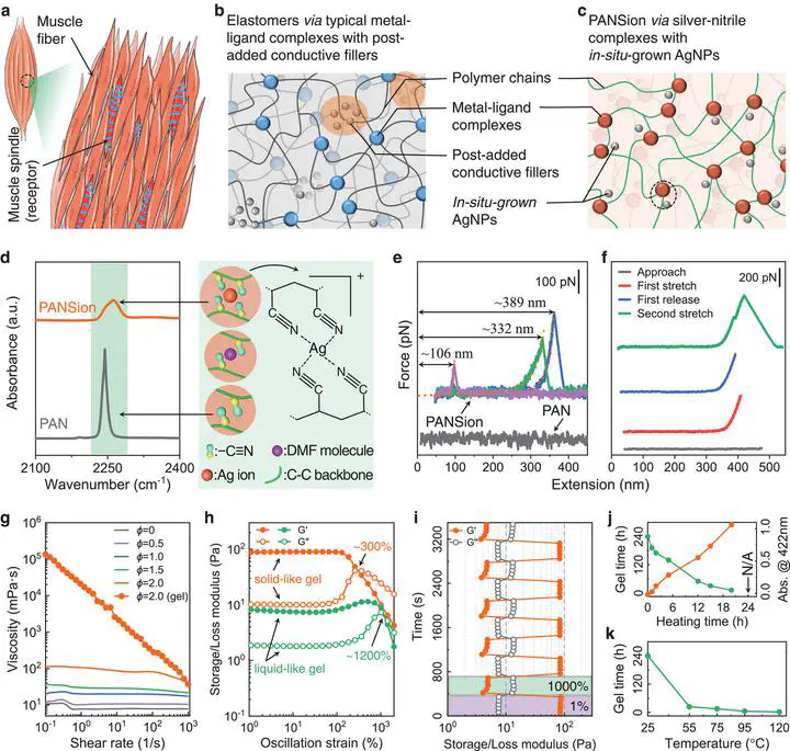Self-sensing actuators are critical to artificial robots with biomimetic proprio-/exteroception properties of biological neuromuscular systems. Existing add-on approaches, which physically blend heterogeneous sensor/actuator components, fall short of yielding satisfactory solutions, considering their suboptimal interfaces, poor adhesion, and electronic/mechanical property mismatches. Here, a single homogeneous material platform is reported by creating a silver–polymer framework (SPF), thus realizing the seamless sensing–actuation unification. The SPF-enabled elastomer is highly stretchable (1200%), conductive (0.076 S m−1), and strong (0.76 MPa in-strength), where the stretchable polymer matrix synthesis and in situ silver nanoparticles reduction are accomplished simultaneously. Benefiting from the multimodal sensing capability from its architecture itself (mechanical and thermal cues), self-sensing actuation (proprio-deformations and external stimuli perceptions) is achieved for the SPF-based pneumatic actuator, alongside an excellent load-lifting attribute (up to 3700 times its own weight), substantiating its advantage of the unified sensing–actuation feature in a single homogenous material. In view of its human somatosensitive muscular systems imitative functionality, the reported SPF bodes well for use with next-generation functional tissues, including artificial skins, human–machine interfaces, self-sensing robots, and otherwise dynamic materials.