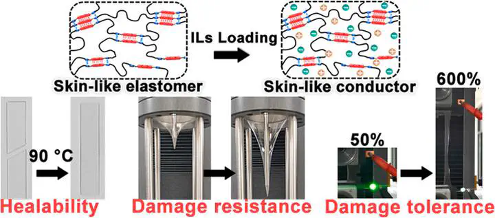 Elastomers play an irreplaceable role in industry and daily life; however, they are usually soft and susceptible to damage. In this study, skin-like poly(urethane-urea) elastomers with high mechanical strength, stretchability, elasticity, and excellent damage resistance, damage tolerance, and healability are fabricated by cross-linking polycaprolactone (PCL) chains with hydrogen-bond arrays. The elastomer, which is denoted as PU-ASC, has a tensile strength of ∼72.6 MPa, recovery strain of ∼500%, and fracture energy of ∼161 kJ m–2. Moreover, the PU-ASC elastomer exhibits unique strain-adaptive stiffening, which endows the elastomer with the capacity to resist damage. The skin-like PU-ASC-IL conductors can be conveniently fabricated by loading ionic liquids (ILs) into the PU-ASC elastomers. The healable, stretchable, elastic, damage-resistant, and damage-tolerant PU-ASC-IL conductors show record-high mechanical performance, with tensile strength, toughness, and fracture energy values of ∼22.8 MPa, ∼164.2 MJ m–3, and ∼73.6 kJ m–2, respectively. The damage resistance and damage tolerance of the elastomers and conductors mainly originate from the disintegrable hydrogen-bond arrays, which are capable of dissipating energy, and the strain-induced crystallization of the PCL segments. Owing to the reversibility of the hydrogen-bond arrays, fractured PU-ASC and PU-ASC-IL can be conveniently healed under heating, restoring their original mechanical performance and conductivity.