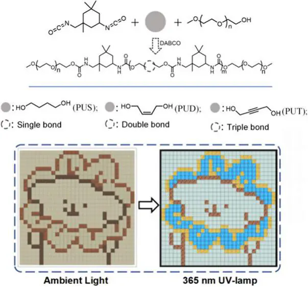 The study of structure−activity relationships is a top priority in the development of nontraditional luminescent materials. In this work, nonconjugated polyurethanes (PUs) with full-color emission (red, green, and blue) are easily obtained by control of the diol monomer structure and the polymerization conditions. Selected diol monomers introduced single, double, or triple bond repeating units into the main chain of the PUs, in order to understand how unsaturated bonds and H-bonds affect their luminescence from a molecular orbital viewpoint. Detailed experimental and theoretical results show that the PUs have different temperature-dependent behaviors related to the interplay of H-bonding, through-space n−π interactions, and aggregation properties. The potential applications of PUs in colorful displays, covert information transmission, and multifunctional bioimaging have been verified. This work provides a new general protocol for the simple preparation of multifunctional nonconventional fluorescent polymers and deepens the understanding of their luminescence mechanisms.