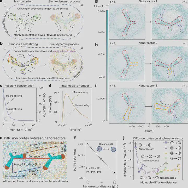 Developing artificial nanomaterial systems that can convert external stimuli to achieve nanoscale self-sustainable motion (for example, self-rotation), and simultaneously integrate and deploy the spatial localization of multiple active sites to unravel the intraparticle diffusion patterns of molecules, is of great importance for green synthetic chemistry. Here we show a paddle-like self-stirring mesoporous silica nanoreactor system with separated chambers and controllable proximity of active sites. The nanoreactors are designed by encapsulating magnetic Fe3O4 (~20 nm) in the first chamber, and meantime, Au and Pd nanocrystals are spatially isolated in different domains. Such a nanoreactor generates nanoscale rotation under the rotating magnetic fields and exhibits an order of magnitude activity enhancement in the cascade synthesis of 5,6-dimethylphenanthridinium (96.4% selectivity) compared with conventional macro-stirring. Meanwhile, we quantitatively uncovered the rotation-induced enhancement in sequential and reverse transfer of reactive intermediates, consequently revealing the relevance of self-rotation and proximity effects in controlling the catalytic performance.