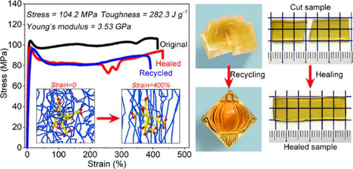 To build a sustainable society, it is of significant importance but highly challenging to develop remalleable, healable, and biodegradable polymeric materials with integrated high strength and high toughness. Here, we report a superstrong and ultratough sustainable supramolecular polymeric material with a toughness of ca. 282.3 J g–1 (395.2 MJ m–3) in combination with a tensile strength as high as ca. 104.2 MPa and a Young’s modulus of ca. 3.53 GPa. The toughness is even higher than that of the toughest spider silk (ca. 354 MJ m–3) ever found in the world, while the material also exhibits a superior tensile strength over most engineering plastics. This material is fabricated by topological confinement of the biodegradable linear polymer of poly(vinyl alcohol) (PVA) via the naturally occurring dendritic molecules of tannic acid (TA) based on high-density hydrogen bonds. Simply blending TA and PVA in aqueous solutions at acidic conditions leads to the formation of TA–PVA complexes as precipitates, which can be processed into dry TA–PVA composite products with desired shapes via the compression molding method. Compared to the conventional solution casting method for the fabrication of PVA-based thin films, the as-developed strategy allows large-scale production of bulk TA–PVA composites. The TA–PVA composites consist of interpenetrating three-dimensional supramolecular TA–PVA clusters. Such a structural feature, revealed by computational simulations, is crucial for the integrated superhigh strength and ultrahigh toughness of the material. The biodegradable TA–PVA composites are remalleable for multiple generations of recycling and healable after break, at room temperature, by the assistance of water to activate the reversibility of the hydrogen bonds. The TA–PVA composites show high promise as sustainable substitutes for conventional plastics because of their remalleability, healability, and biodegradability. The integrated superhigh strength and ultrahigh toughness of the TA–PVA composites ensure their high reliability and broad applicability.