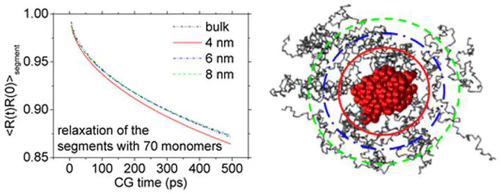 It is crucial to understand how much and how far the structure and dynamics properties of the polymer melt can be affected by incorporating nanoparticles (NPs) in the system. Here, we show that in an athermal all-polymer nanocomposites prepared from mixtures of linear polystyrene chains and cross-linked polystyrene NPs, the influence range of the NP on the melt polymer properties, namely interphase thickness, depends on the properties investigated. The local segment conformations can be affected in the range of an NP radius. However, if the interphase thickness is defined by the influence range of the NP on the radius of gyration (Rg) of the melt chain, it can be 1.5Rg for short-chain melts where the chain has a Rg smaller than particle radius Ra. For intermediate chain length polymer melts (Rg > Ra), the influence range of the NP does not change with the chain length. With the chain length further increasing, melt chains cannot feel the existence of the NP; the influence of the NP on the Rg tensors of the melt chain can be negligible. For the dynamics properties, the effects caused by the NP can be differently at different length and time scales. The mobility of the monomers can be slowed down in the vicinity of the NP, but they can have a faster mobility in the tangential direction than in the radial direction of the NP surface. More importantly, the segmental relaxation of the melt chains can be accelerated by the fast thermal deformations of the loose NP surface structures. We demonstrate that the softness of the NP and its deformability are crucial to the dynamics properties of the nanocomposites.