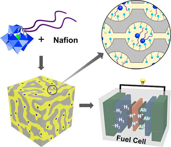 Advanced proton exchange membranes (PEMs) are highly desirable in emerging sustainable energy technology. However, the further improvement of commercial perfluorosulfonic acid PEMs represented by Nafion is hindered by the lack of precise modification strategy due to their chemical inertness and low compatibility. Here, we report the robust assembly of polyethylene glycol grafted polyoxometalate amphiphile (GSiW11) into the ionic nanophases of Nafion, which largely enhances the comprehensive performance of Nafion. GSiW11 can coassemble with Nafion through multiple supramolecular interactions and realize a stable immobilization. The incorporation of GSiW11 can increase the whole proton content in the system and induce the hydrated ionic nanophase to form a wide channel for proton transport; meanwhile, GSiW11 can reinforce the Nafion ionic nanophase by noncovalent cross-linking. Based on these synergistic effects, the hybrid PEMs show multiple enhancements in proton conductivity, tensile strength, and fuel cell power density, which are all superior to the pristine Nafion. This work demonstrates the intriguing advantage of molecular nanoclusters as supramolecular enhancers to develop high-performance electrolyte materials.