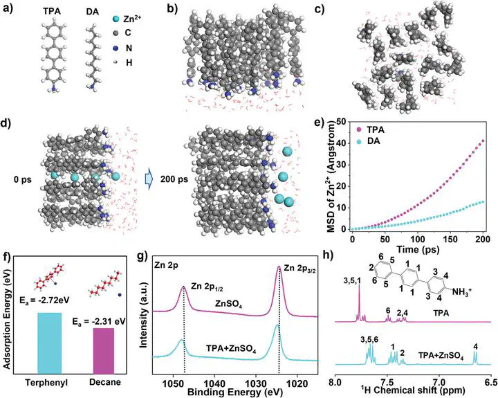 Ensuring effective and controlled zinc ion transportation is crucial for functionality of the solid electrolyte interphase (SEI) and overall performance in zinc‐based battery systems. Herein the first‐ever demonstration of incorporate cation‐π interactions are provided in the SEI to effectively facilitate uniform zinc ion flux. The artificial SEI design involves the immobilization of 4‐amino‐p‐terphenyl (TPA), a strong amphiphilic cation‐π interaction donor, as a monolayer onto a conductive poly(3,4‐ethylenedioxythiophene) (PEDOT) matrix, which enable the establishment of a robust network of cation‐π interactions. Through a carefully‐designed interfacial polymerization process, a high‐quality, large‐area, robust is achieved, thin polymeric TPA/PEDOT (TP) film for the use of artificial SEI. Consequently, this interphase exhibits exceptional cycling stability with low overpotential and enables high reversibility of Zn plating/stripping. Symmetrical cells with TP/Zn electrodes can be cycled for more than 3200 hours at 1 mA cm −2 and 1 mAh cm −2 . And the asymmetric cells can cycle 3000 cycles stably with a high Coulomb efficiency of 99.78%. Also, under the extreme conditions of lean electrolyte and low N/P ratio, the battery with TP protective layer can still achieve ultra‐stable cycle.