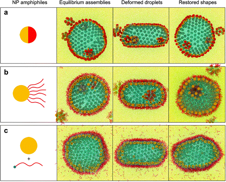 The nanoparticle (NP) surfactants generated in situ by binding NPs and polymers can assemble into an elastic NP monolayer at the interface of two immiscible liquids, structuring the liquids. Janus NPs can be more strongly bound to the interface than the NP surfactants, but they are unable to structure liquids into complex shapes due to the difficulty of assembling the jamming arrays. By molecular dynamics simulations, we give an insight into the better performance of NP surfactants than Janus NPs on dynamically structuring liquids. The high energy binding of Janus NPs to the interface will drive the Janus NPs to assemble into micelles in binary liquids. The micelles are stabilized in one liquid by encapsulating a little of the other liquid, hindering interfacial adsorption when the interface is marginally extended upon liquid deformation. In contrast, the in situ formed NP surfactants can rapidly fill the enlarged interfacial area to arrest the consecutive shape changes of the liquids. Moreover, NP surfactants can be designed with an appropriate coverage ratio (≤50%) of NP surface bearing host–guest sites to avoid dissolution and impart a desirable mechanical elasticity to their assembly.