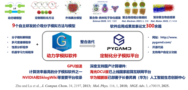 上述进展得益于吕中元教授/朱有亮研究员团队长期坚持的介观尺度软物质分子模拟软件平台建设工作–成功研制了具有完全自主知识产权的软件平台PyGAMD(软著登字第8522235号)。作为国家“十四五”重点研发计划“关键聚合物结构材料集成计算设计方法与应用”项目(2022YFB3707300)的标志性成果,该软件平台实现了从基础算法到应用的全链条创新,集成了具有自主知识产权的聚合物分子构型生成工具、分子动力学模拟引擎、数据分析程序、分子动力学解释器和机器学习力场等功能模块;支持国产异构计算平台,构建了从软件到硬件的自主可控技术体系;具有9个自主开发的介观尺度分子模拟方法/模型,应用模拟结果已在Science等刊物上发表文章超过300篇;软件应用在吉林省亚安新材料有限公司、北京玲珑轮胎有限公司等单位的聚合物材料研发中,显著加速研发进程和降低研发成本。该软件平台不仅加强了我国在高端分子模拟软件领域的实力,更为突破国外技术垄断、实现关键材料自主研发提供了强有力的工具支撑。